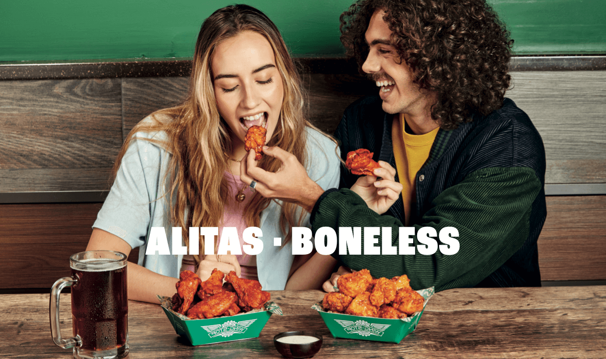 Imágenes ilustrativas. Papas Francesas en los Paquetes de 6 y 10 Alitas/Boneless (200g c/u), Papas Francesas M (250g), Papas Francesas G (380g), Veggie Sticks (10 pzas), Aderezo M (50ml), Aderezo G (120ml), Refresco de lata